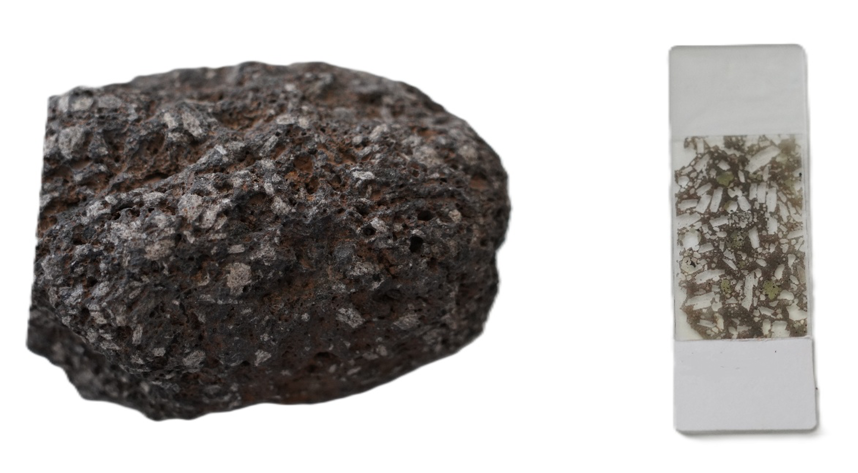 Gambar 2. Contoh batuan spesimen tangan andesit dari G. Tambora (kiri) dan sayatannya (kanan)