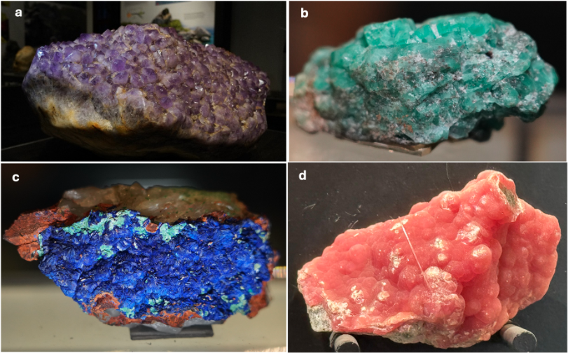 Gambar 2. Koleksi mineral : (a) ametis, (b) zamrud, (c) azurite, dan (d) rhodochrosite yang dipamerkan di Ruang Geologi Indonesia.