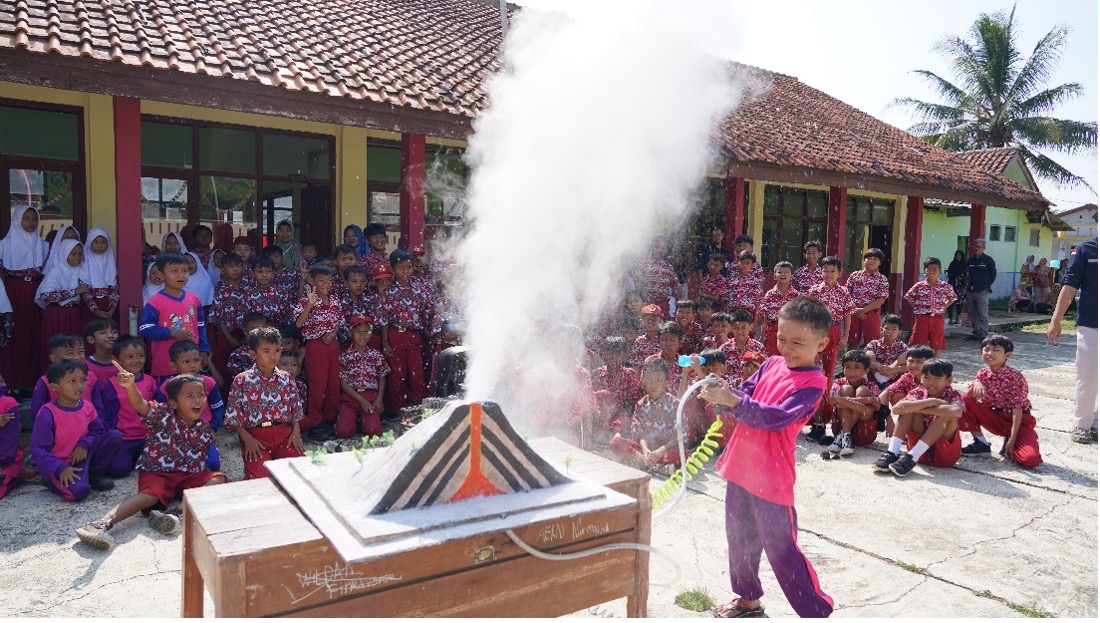 Salah satu siswa mencoba simulasi letusan gunung api