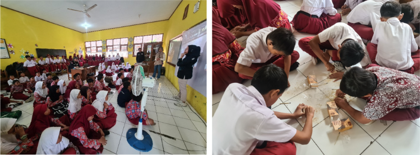 Suasana edukasi di dalam kelas, pengenalan Museum Geologi dan Koleksinya (kiri) serta Simulasi Menggali Fosil (kanan)