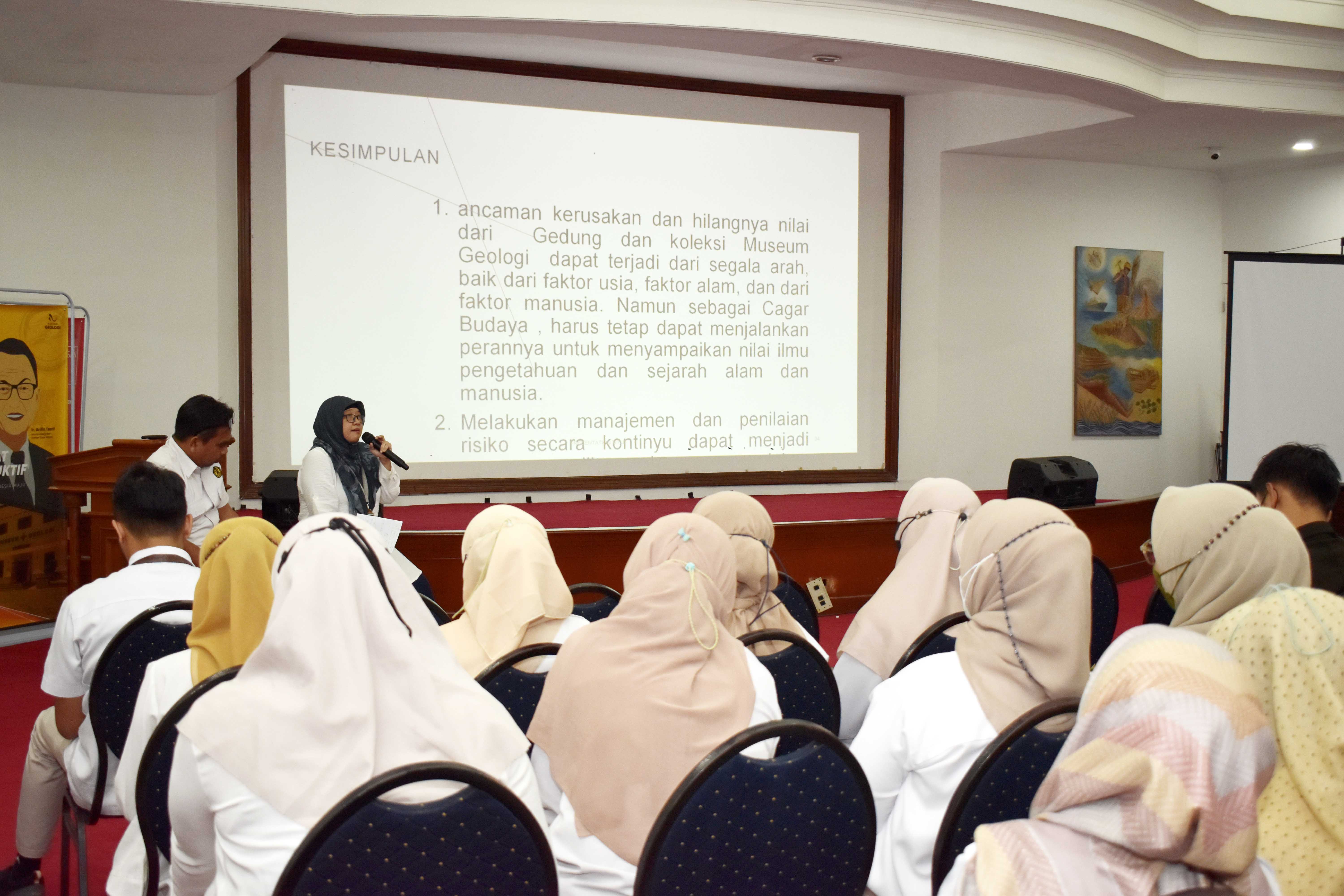 Pertama disampaikan materi tentang Manajemen Risiko Gedung dan Koleksi Museum Geologi oleh Ita Yulita, S.Si., M.Hum. Sesi pertama ini dipimpin oleh moderator Arief Kurniawan, S.T. Ruang lingkup yang dibahas dalam pemaparan pertama ini adalah Gedung, Koleksi dan Manusia (pengunjung dan pegawai) di Museum Geologi.