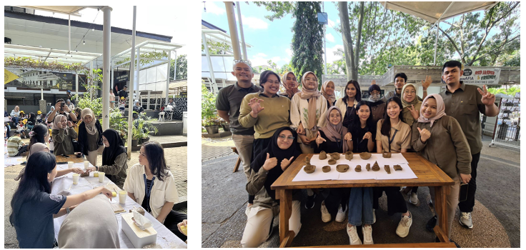Setiap peserta diberi sebongkah tanah liat yang masih lembek, basah, dan jujur saja sedikit membuat ragu di awal: “Ini beneran bisa jadi sesuatu, ya?” Tapi justru dari bentuk yang tidak pasti itulah kami mulai belajar banyak hal. Dari membasahi tangan, memijat tanah liat, mencoba membentuknya sesuai imajinasi dan kreasi masing-masing, hingga merapikannya perlahan, membuat kami sadar bahwa proses ini bukan tentang hasil yang sempurna, melainkan tentang pengalaman yang jujur dan menyentuh langsung nilai-nilai dari masa lalu. Gerabah hasil kreasi peserta pun bervariasi, ada yang membuat sarang lebah, mangkuk kecil, piring, hingga rusa. Setelah bentuk dasarnya jadi, kami menambahkan sentuhan akhir pada permukaan gerabah seperti memberi tekstur menggunakan kain bermotif jaring, atau benda-benda lain yang kami jumpai di sekitar (Gambar 2).